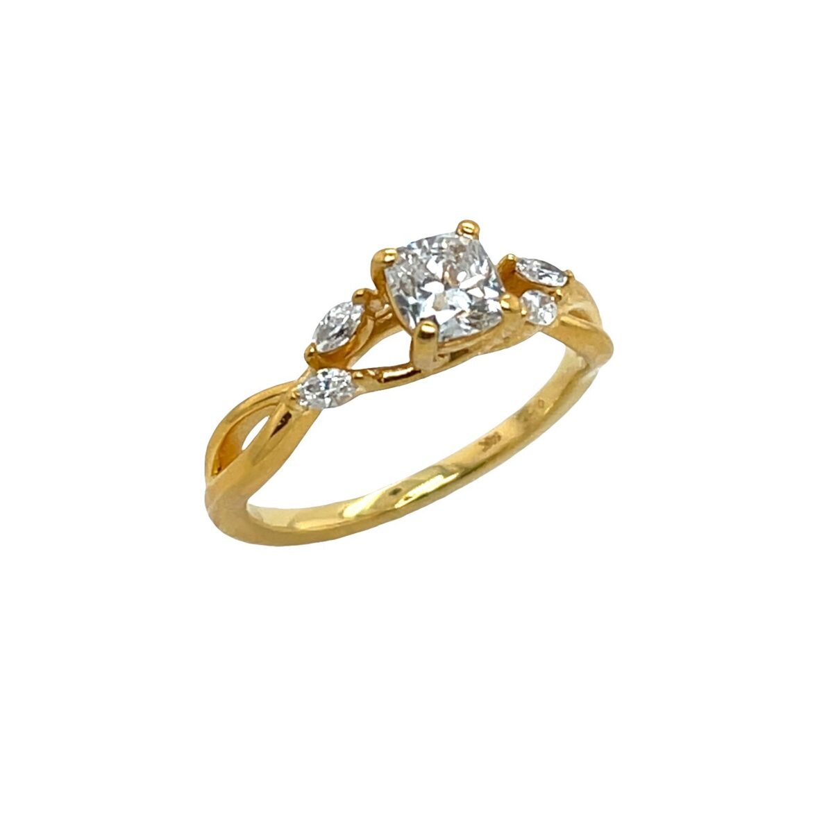 A timeless 14k yellow gold ring featuring a GIA-certified round brilliant cut diamond at its centre. Flanked by four marquise-cut diamonds on either side, this design combines classic elegance with a touch of vintage charm, making it a perfect choice for a unique engagement ring or a statement piece.