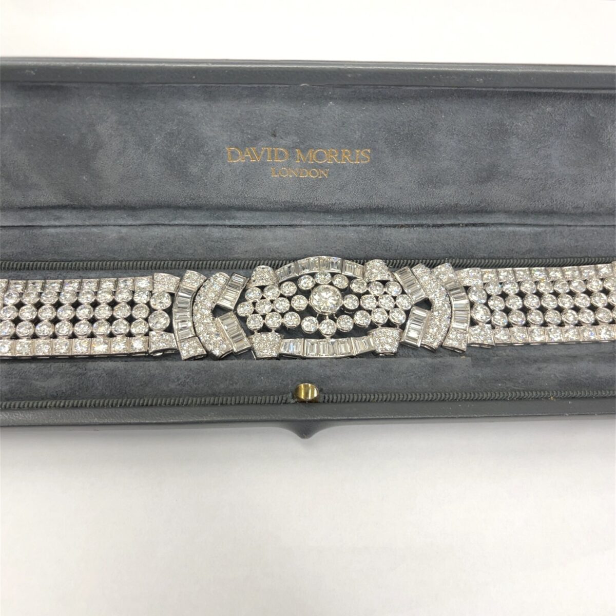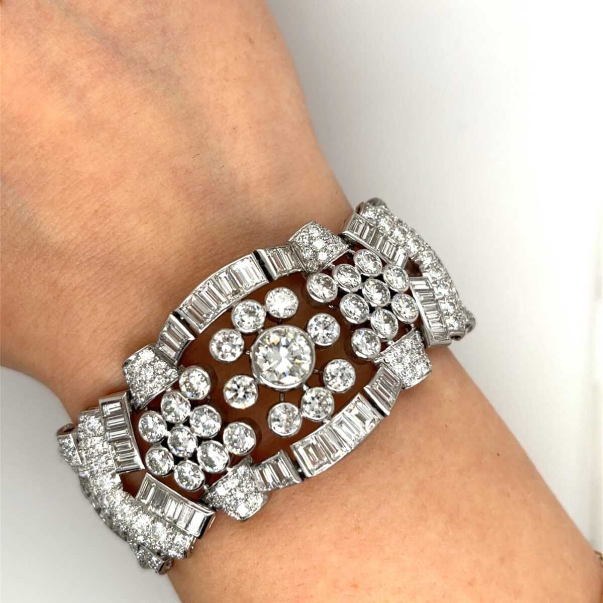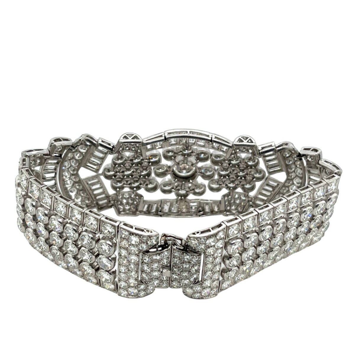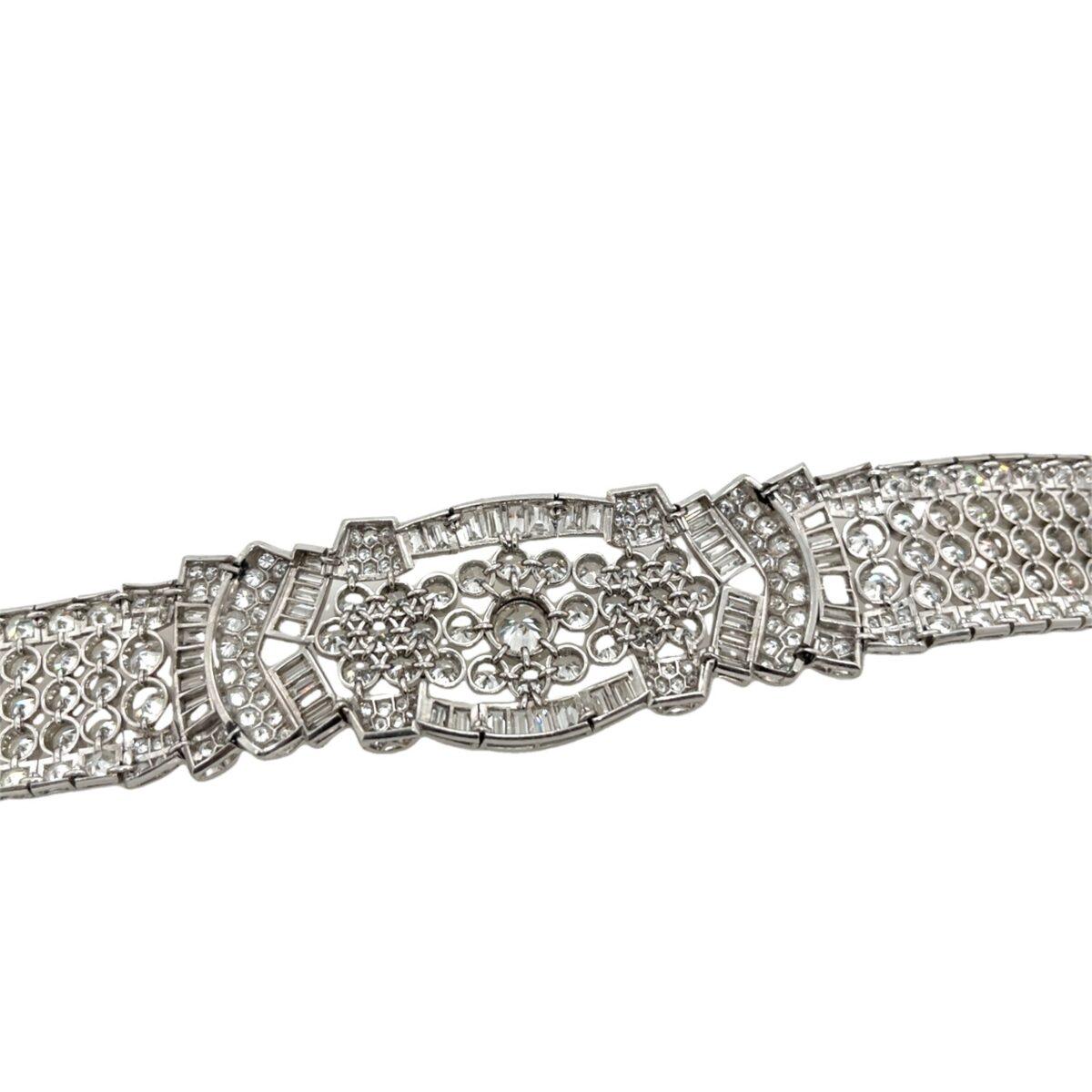 This extraordinary Art Deco bracelet is set with a dazzling 31.40ct of round and baguette diamonds, beautifully crafted in platinum. The stunning design exemplifies the luxurious elegance of the Art Deco era, with its intricate detailing and timeless sophistication, making it a true masterpiece.
