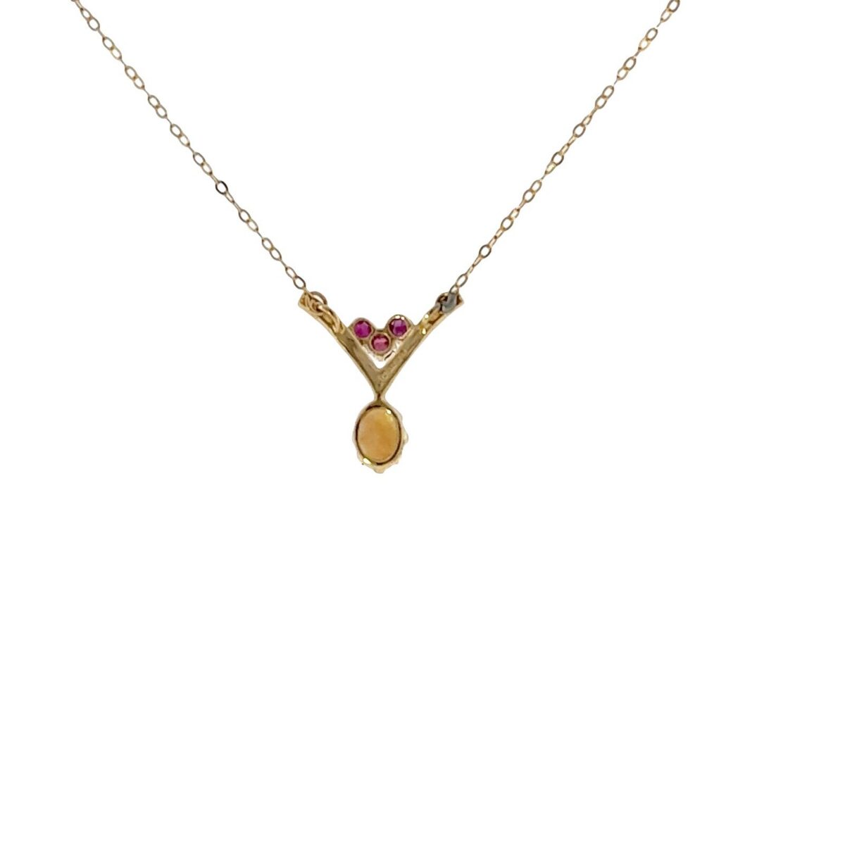 A delicate pendant crafted in 9ct yellow gold, featuring a luminous opal and 3 vibrant rubies. The combination of the soft opal glow and the rich red ruby creates a timeless and elegant design, perfect for everyday wear or special occasions.