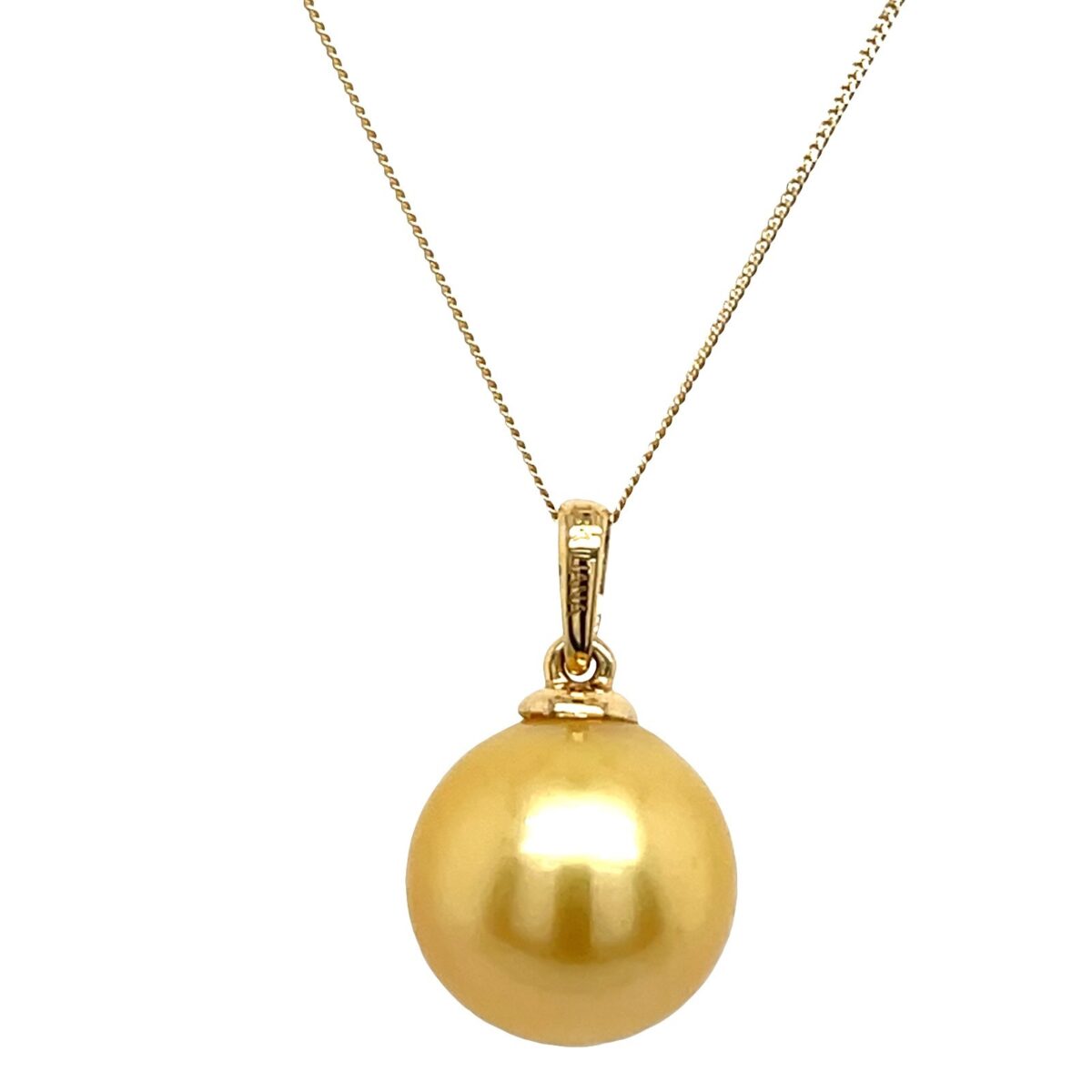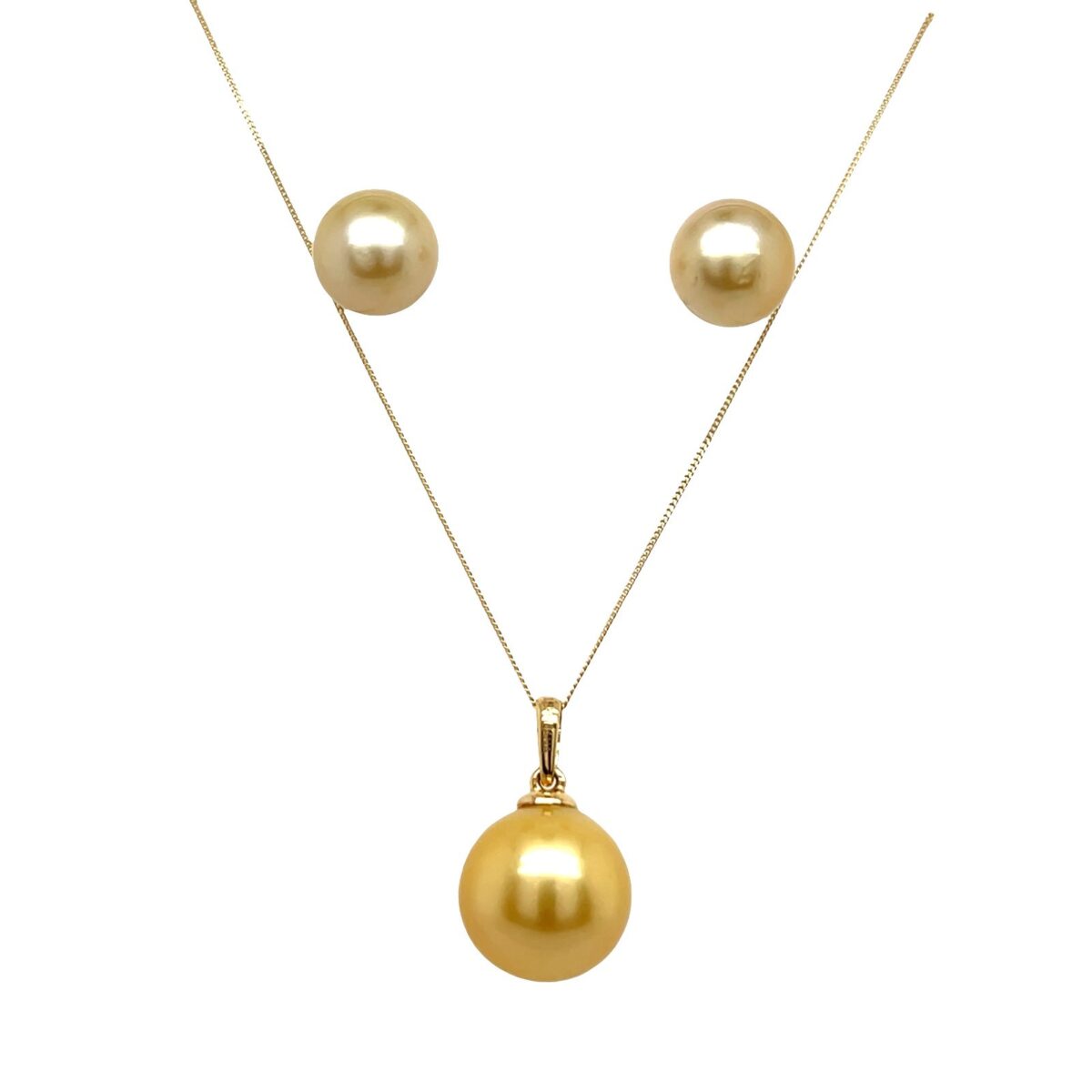 An elegant Golden South Sea Pearl jewellery set, comprising a matching pendant and earrings, beautifully crafted in solid 18ct yellow gold. Featuring luminous natural golden South Sea pearls, this timeless set showcases exceptional lustre and classic sophistication.