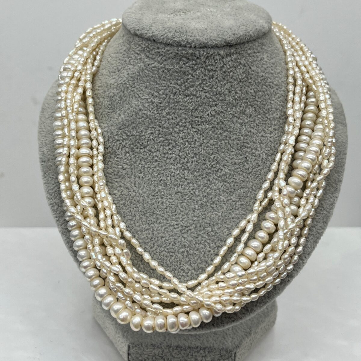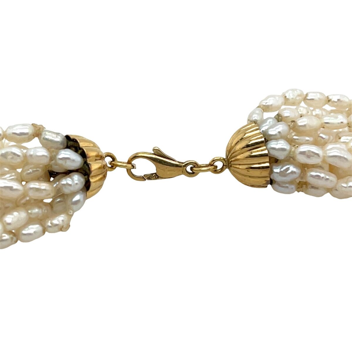A graceful vintage freshwater 10 rows pearl necklace featuring a 9ct yellow gold clasp. This elegant piece combines timeless beauty with a subtle touch of luxury.