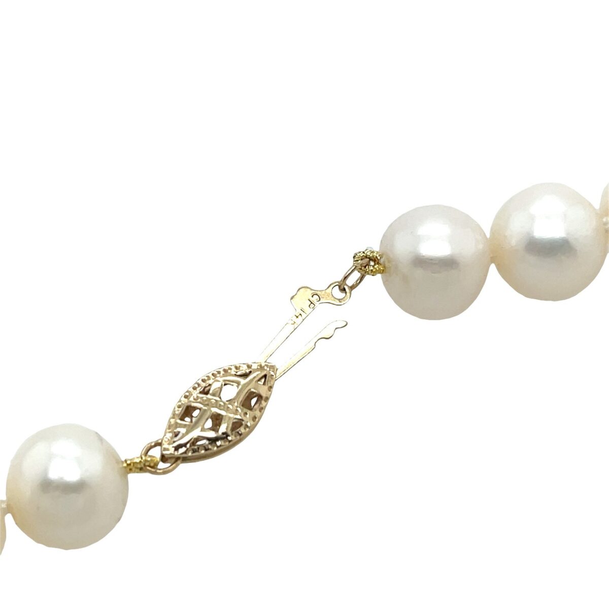 A graceful vintage freshwater 9.5mm pearl necklace featuring a 14ct yellow gold clasp. This elegant piece combines timeless beauty with a subtle touch of luxury.