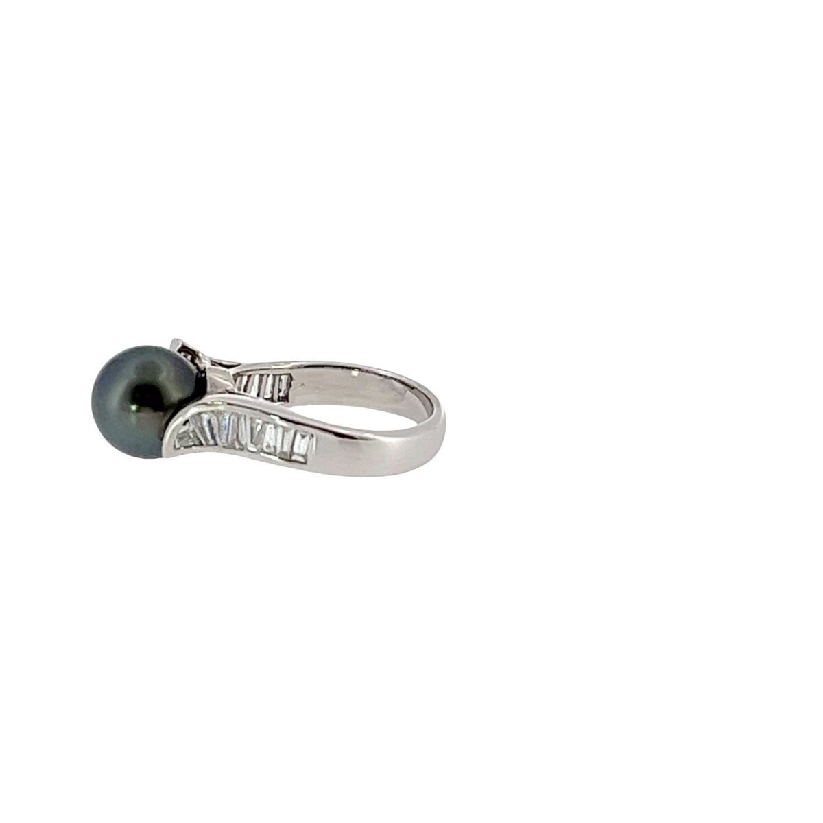 A sophisticated vintage ring crafted in 18ct white gold, featuring a lustrous pearl centerpiece flanked by 0.60ct of tapered baguette-cut natural diamonds. The combination of pearl and geometric diamonds creates a classic, elegant design with vintage charm.