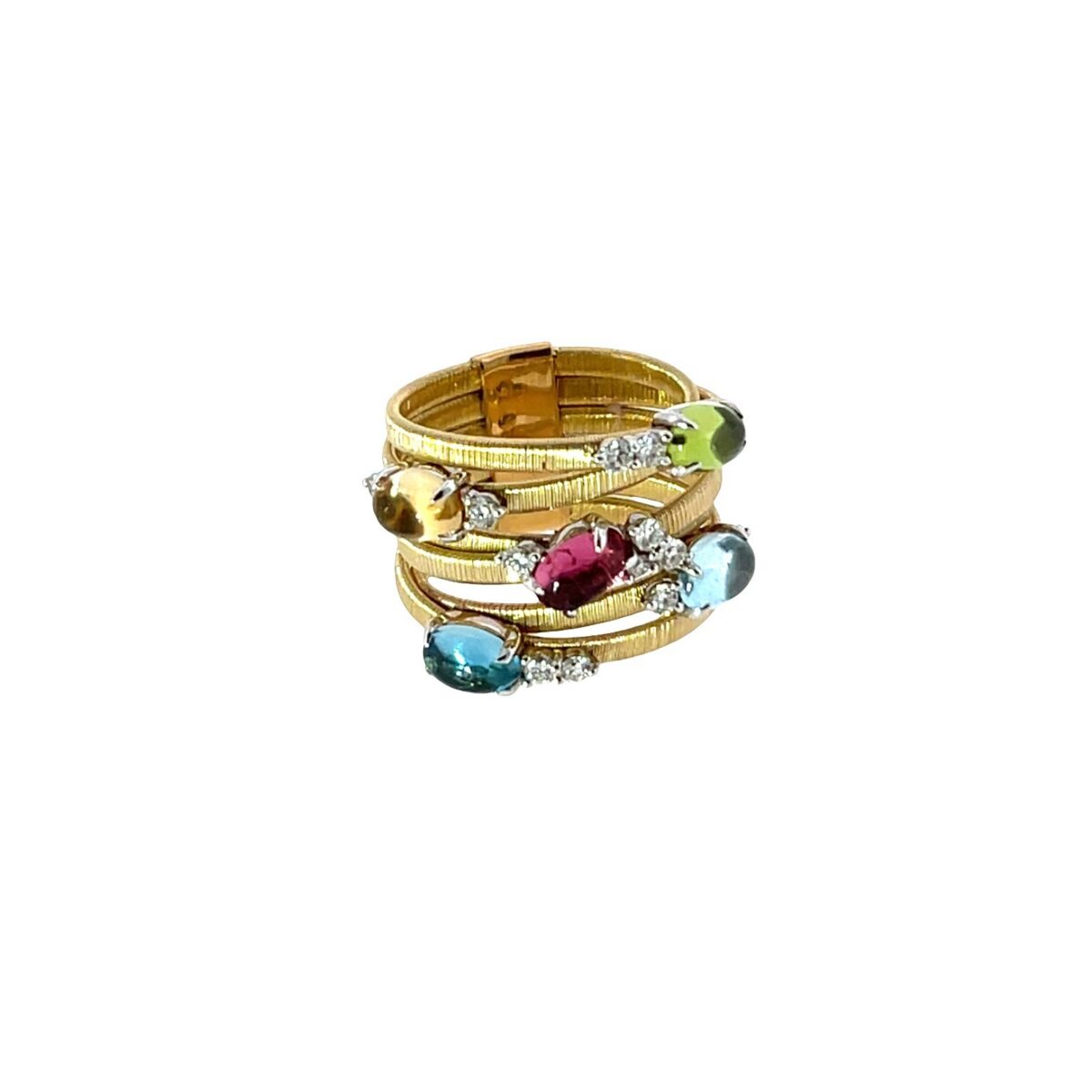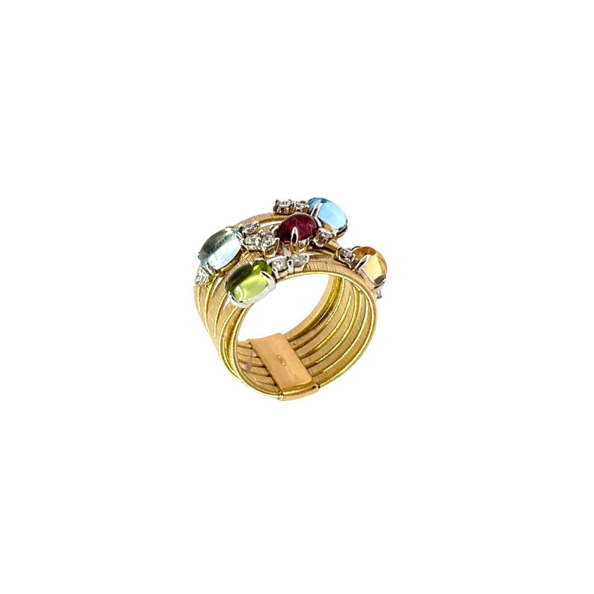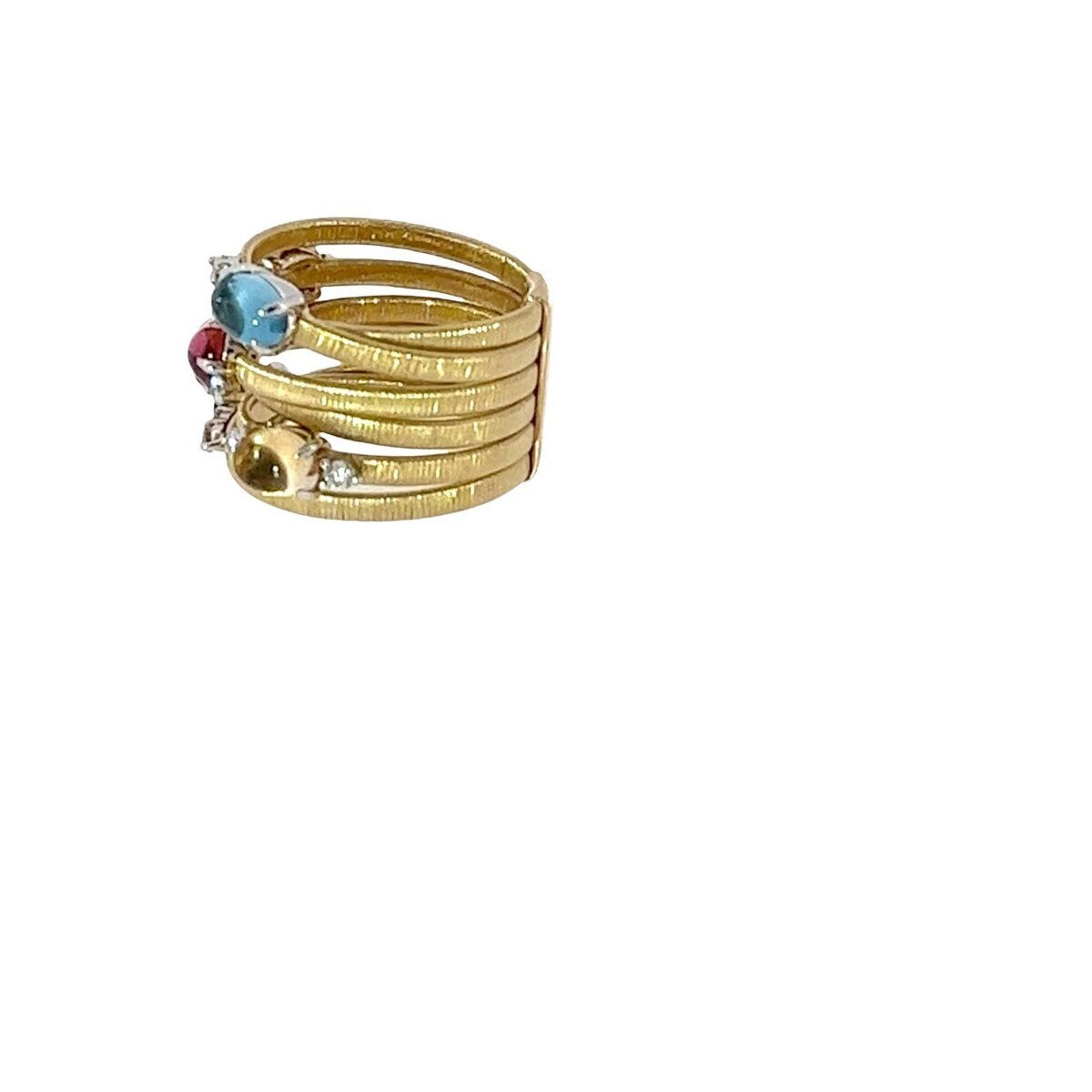 A vibrant and eye-catching multi-gemstone ring crafted in solid 18ct gold, featuring a stunning array of oval cabochon gemstones including blue topaz, aquamarine, peridot, and pink & yellow sapphires.