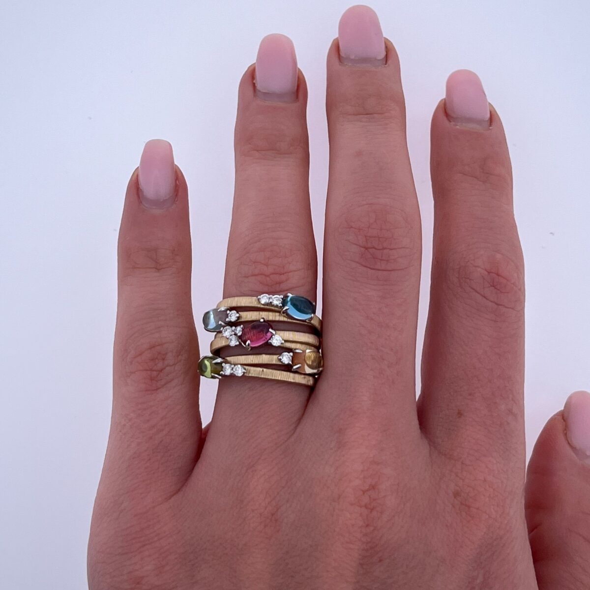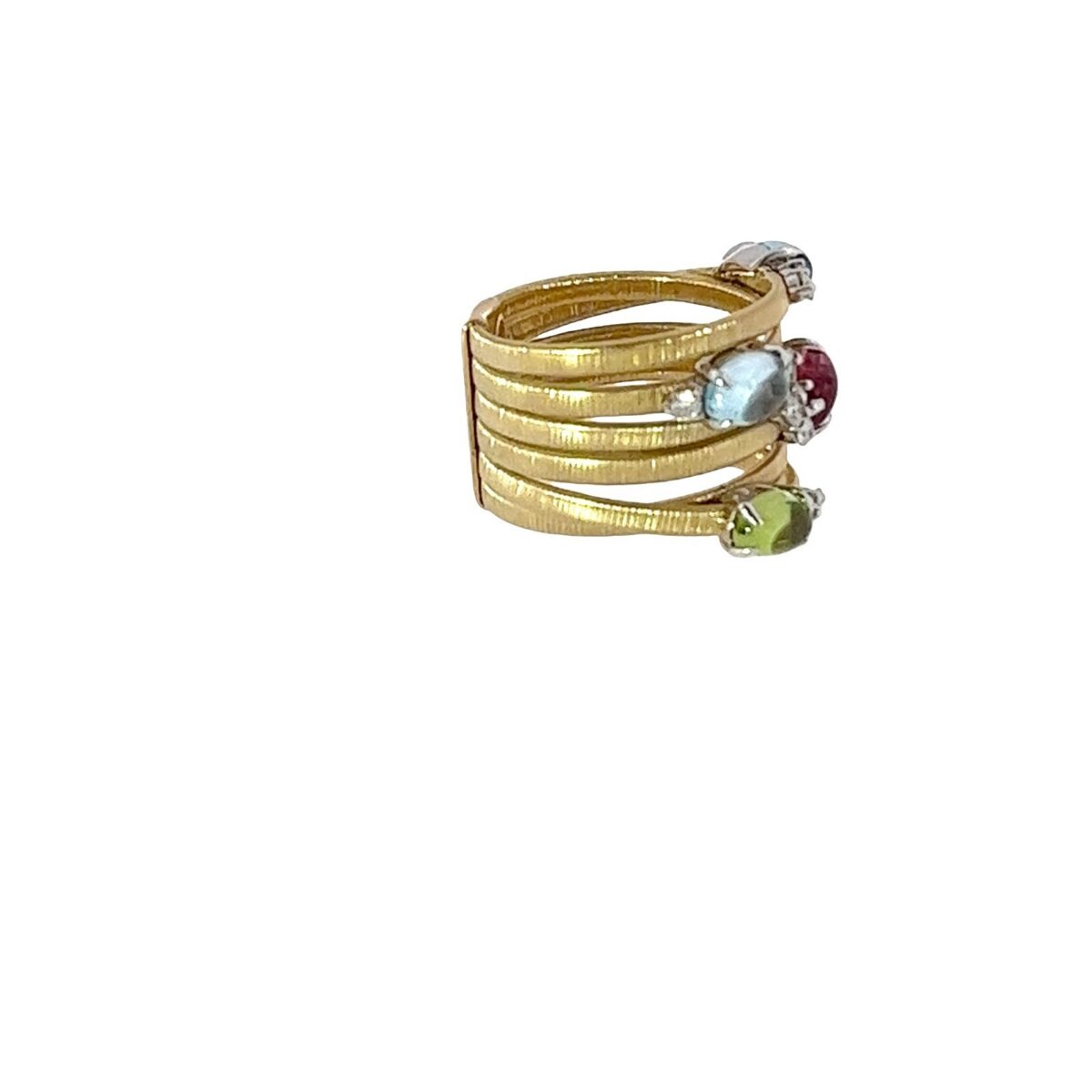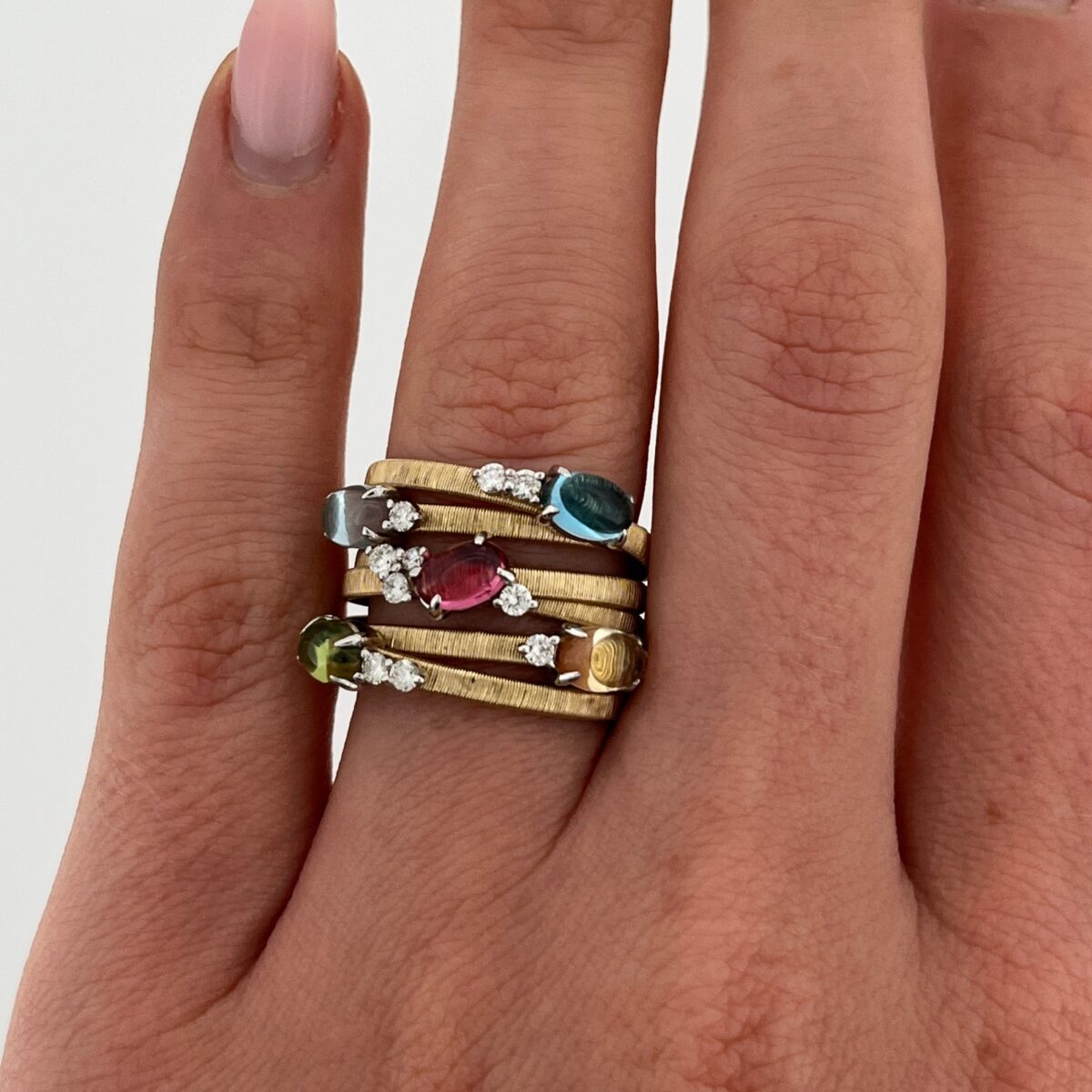 A vibrant and eye-catching multi-gemstone ring crafted in solid 18ct gold, featuring a stunning array of oval cabochon gemstones including blue topaz, aquamarine, peridot, and pink & yellow sapphires.