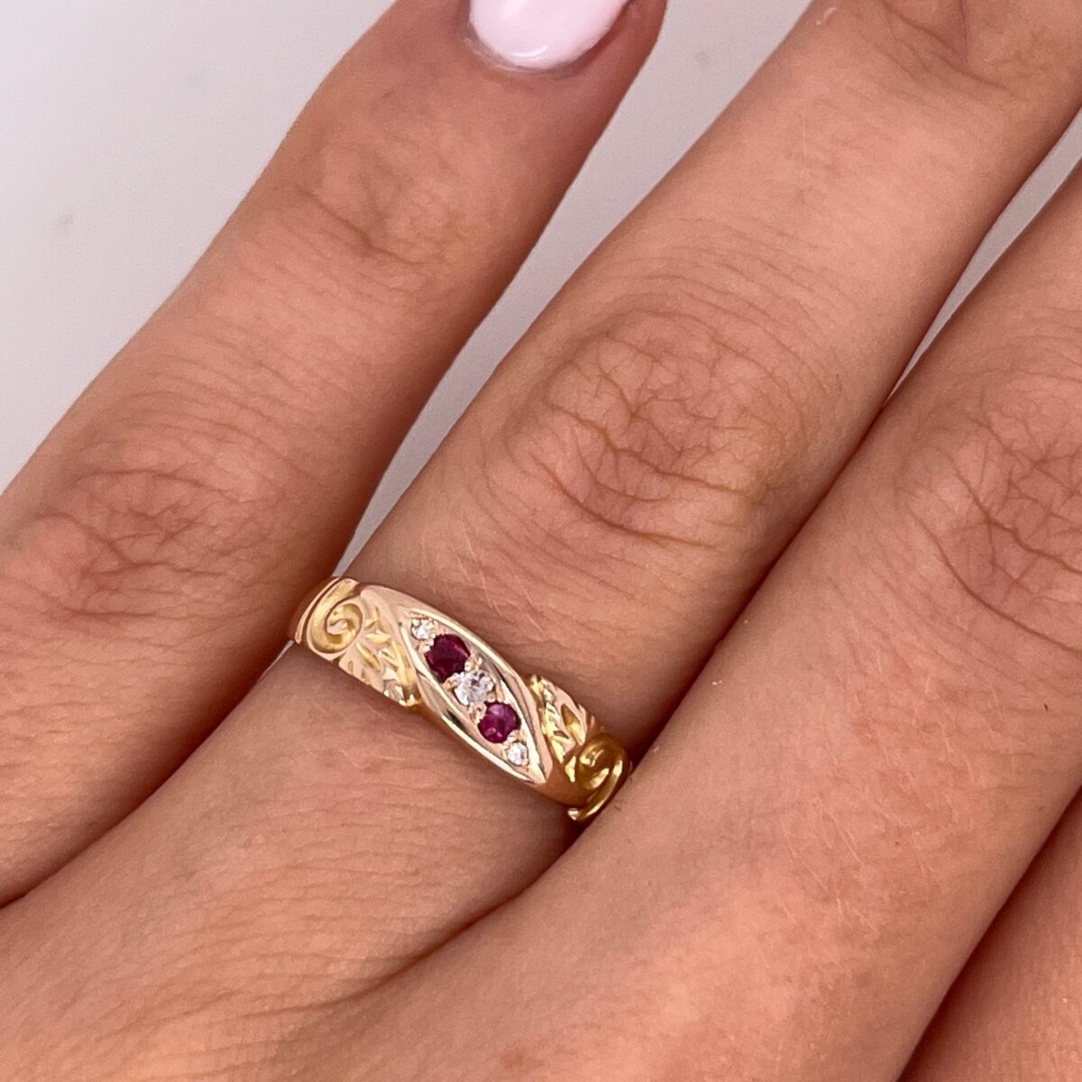 9ct Yellow Gold Ring Set with 2 Rubies & Diamonds