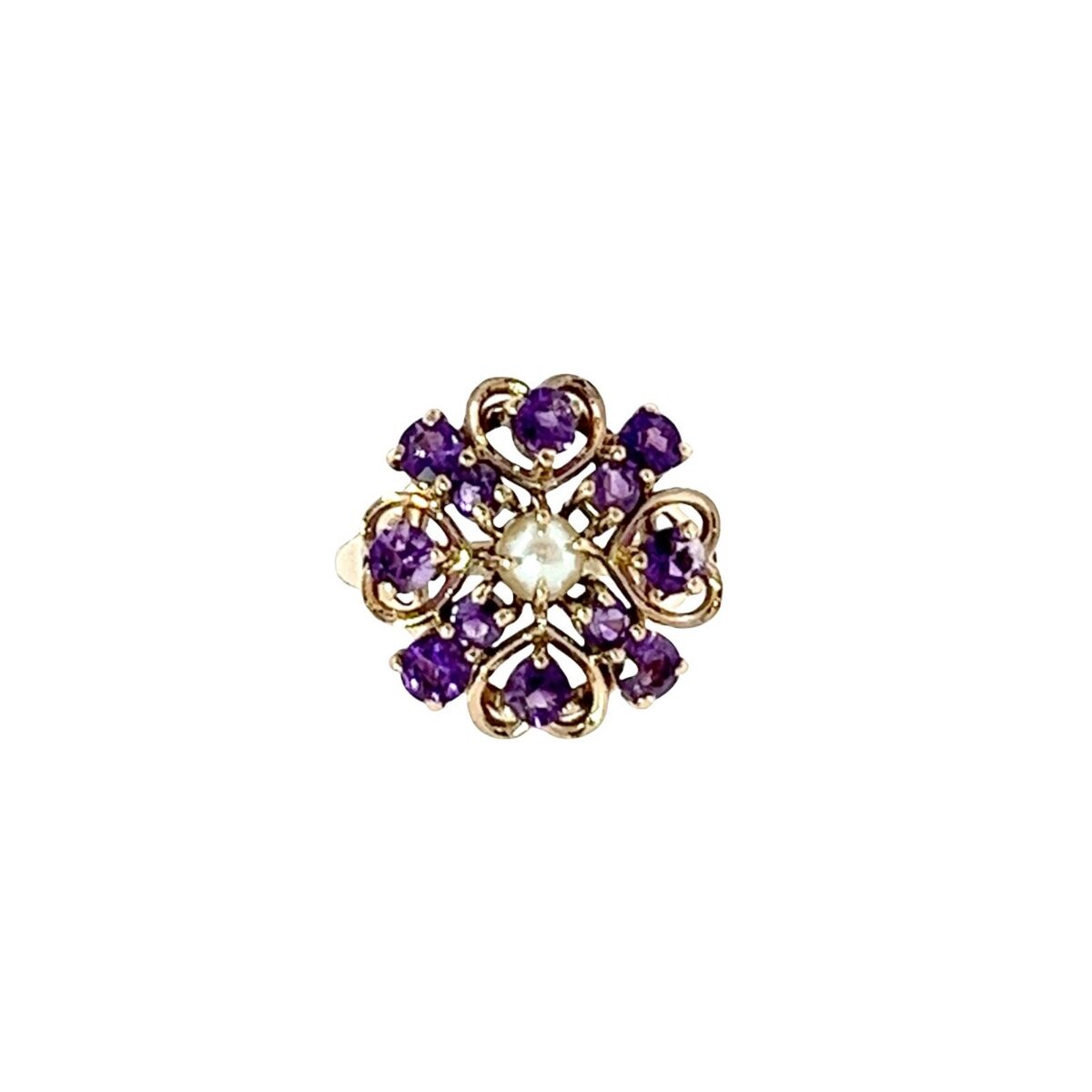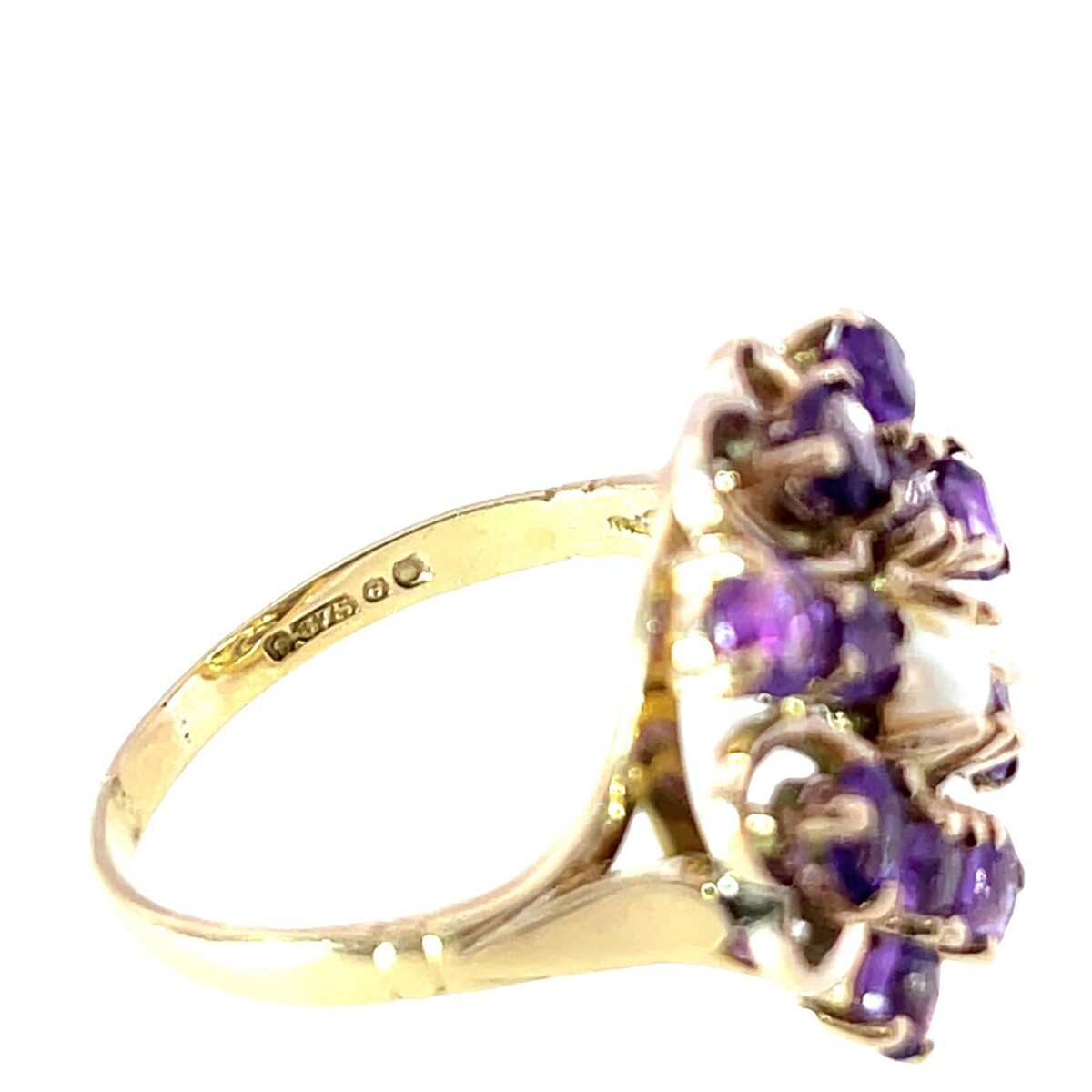 A charming cluster ring crafted in 9ct yellow gold, featuring a combination of vivid amethysts and lustrous pearl. The clustered arrangement creates a classic, elegant design, perfect for vintage jewellery lovers or as a statement dress ring.
