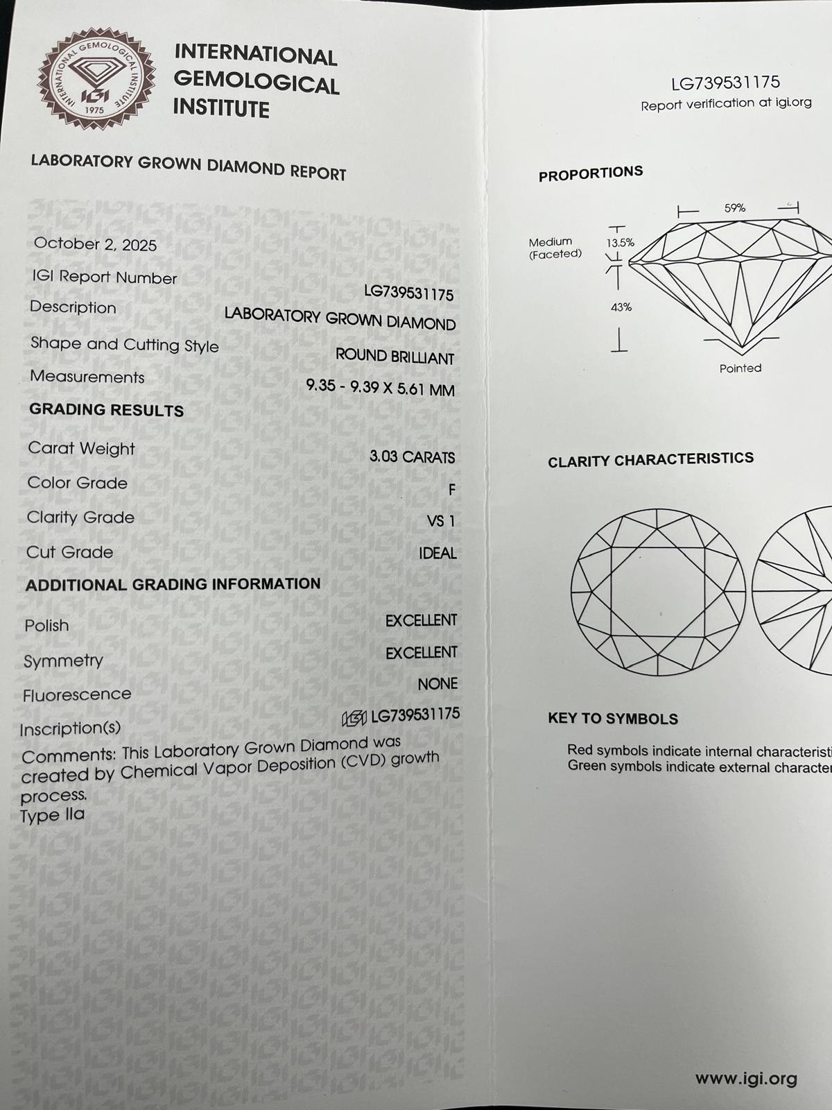 Classic Solitaire 3.0ct IGI Lab created Diamond Engagement Ring