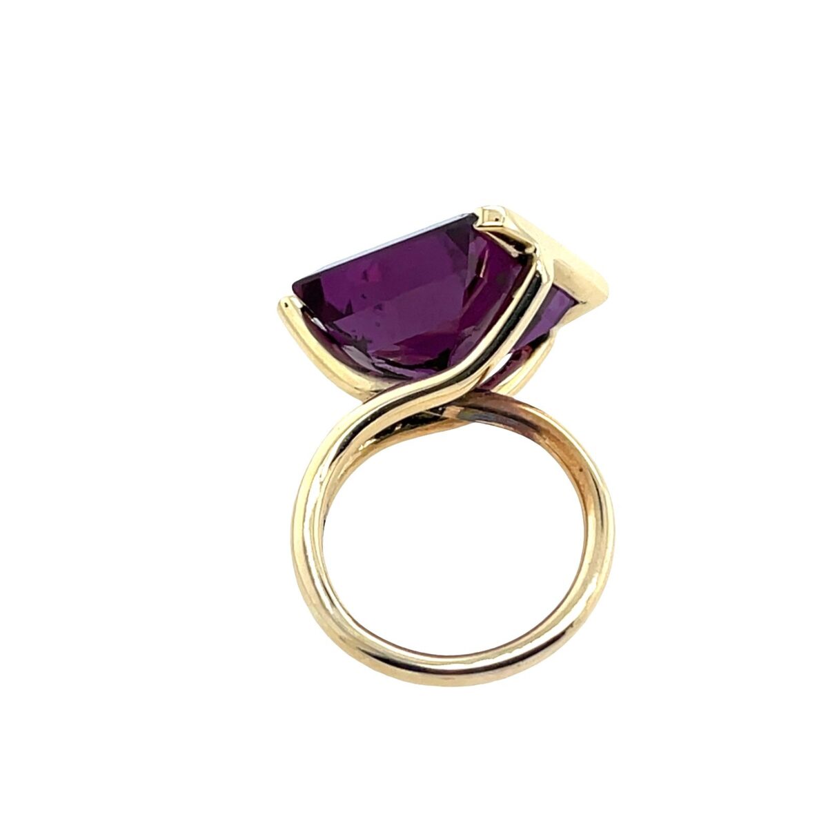 Dress Ring set with natural amethyst, crafted in 9ct yellow gold. This eye-catching piece features a diamond-shaped amethyst at its center, showcasing the stone’s rich purple hue. The sleek gold setting highlights the unique cut of the amethyst, creating a bold and elegant design ideal for evening wear or adding a statement to any outfit.