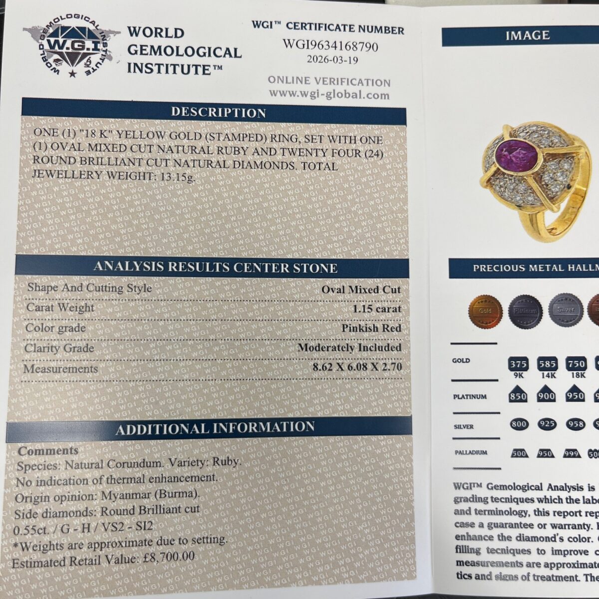 A stunning vintage ruby and diamond cluster ring, showcasing a beautiful oval-cut ruby at its centre,surrounded by a sparkling halo of diamonds.The rich red oval ruby (approx. 1.15ct) is the focal point of this elegant ring, framed by a cluster of brilliant-cut diamonds that enhance its colour and brilliance.