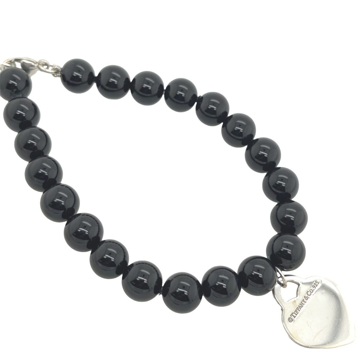 A modern twist on the iconic Return to Tiffany & Co. bracelet, featuring 8mm black onyx beads and a sterling silver heart tag. Sleek, stylish, and perfect for everyday wear or as a thoughtful gift.