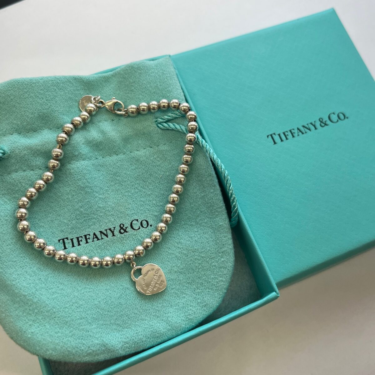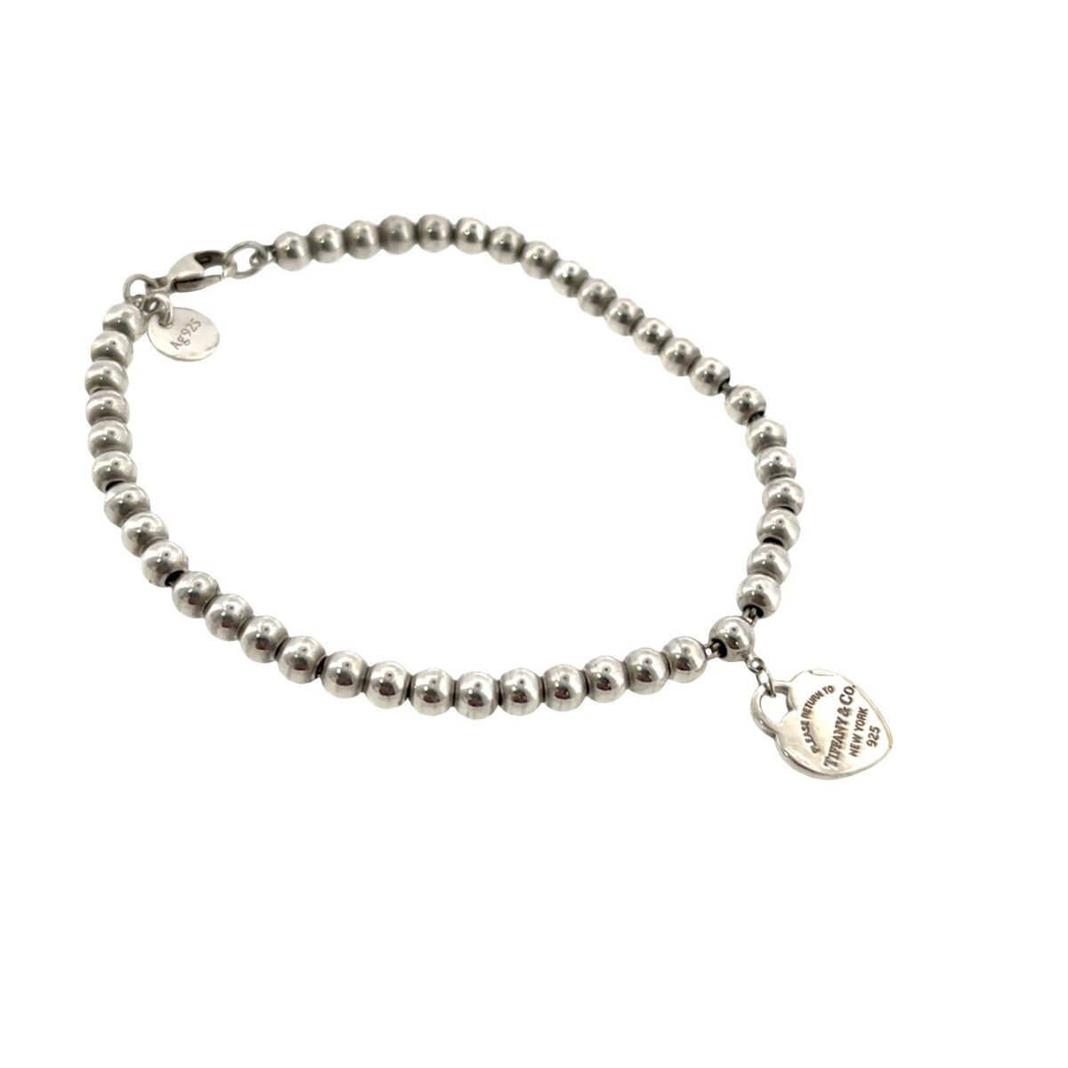 A classic Tiffany & Co. Return to Tiffany bracelet crafted in sterling silver, featuring the iconic heart tag charm and a stylish beaded ball chain design. This timeless piece reflects Tiffany’s signature elegance and instantly recognisable style.