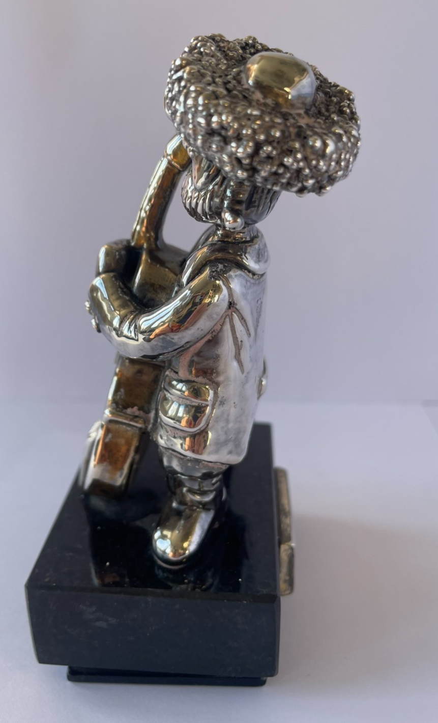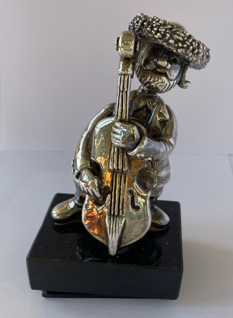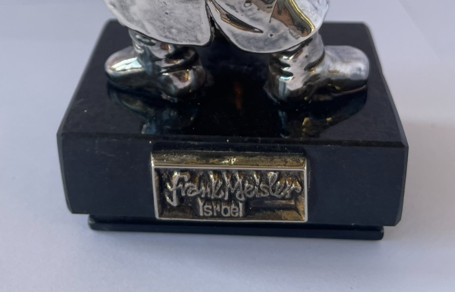 The sculpture is set on a bouncing polished black granite base. It has a spring under it and a metal base that is covered in green felt. This is to emulate the movement of his playing. On the back of the plinth is a gold-plated plaque that says “Frank Meisler, Israel”