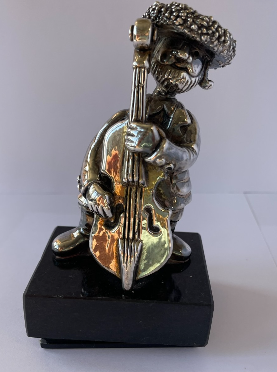 The sculpture is of a Chassidic cellist, most likely part of a band.