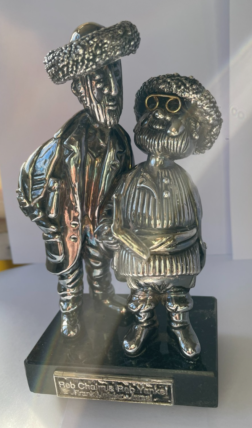 On the base is a plaque that reads, “Reb Chaim and Reb Yankel, Frank Meisler, Israel”