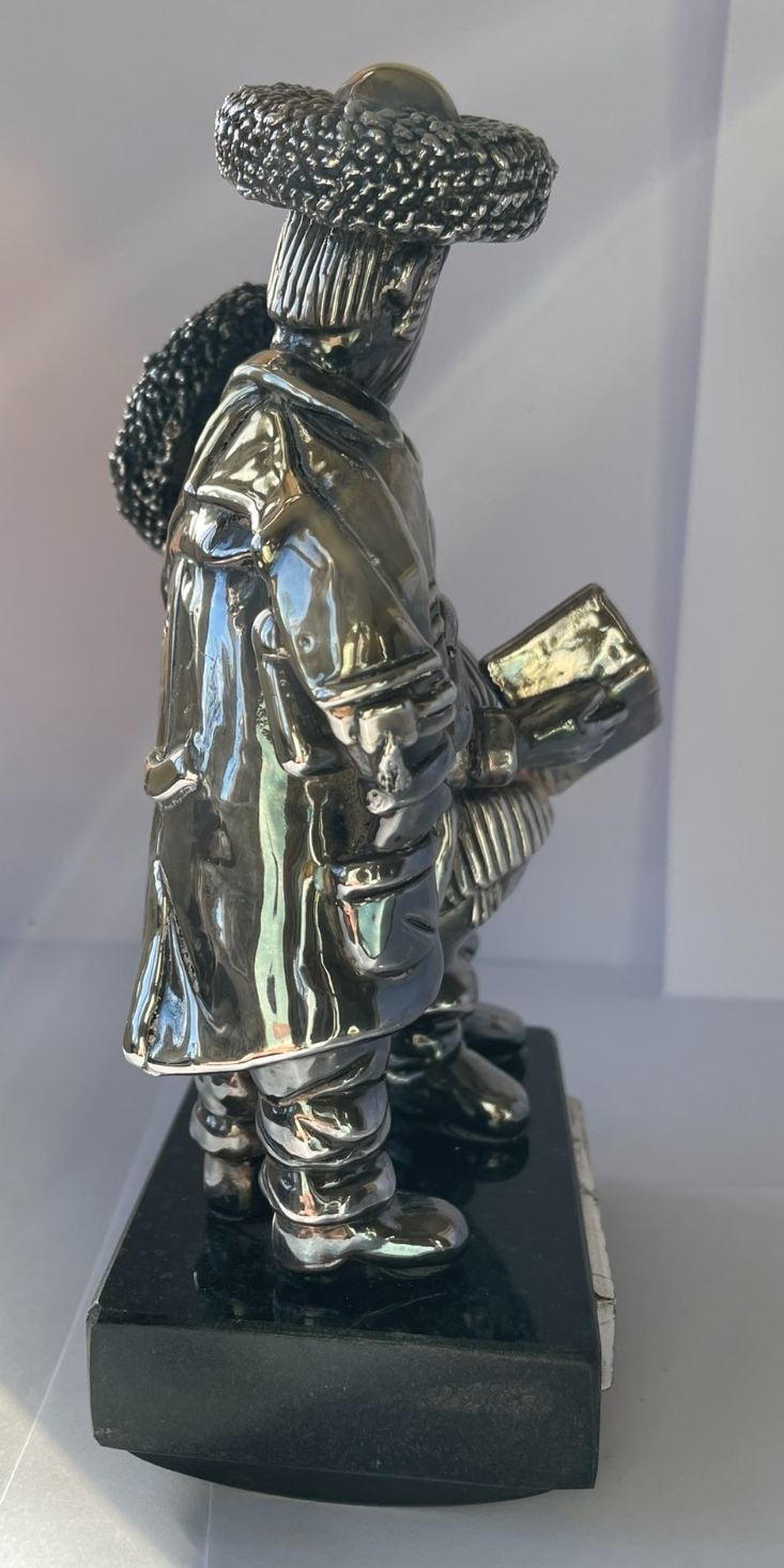 The figures are crafted from mixed metal alloys with silver and gold plated elements. They stand on a black granite rocking base, so you can rock them and they can shochel up and down. Please see our other items in this collection.