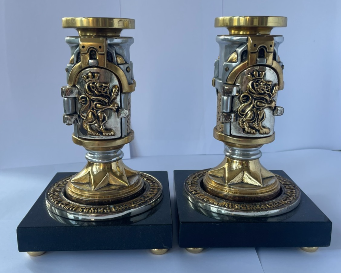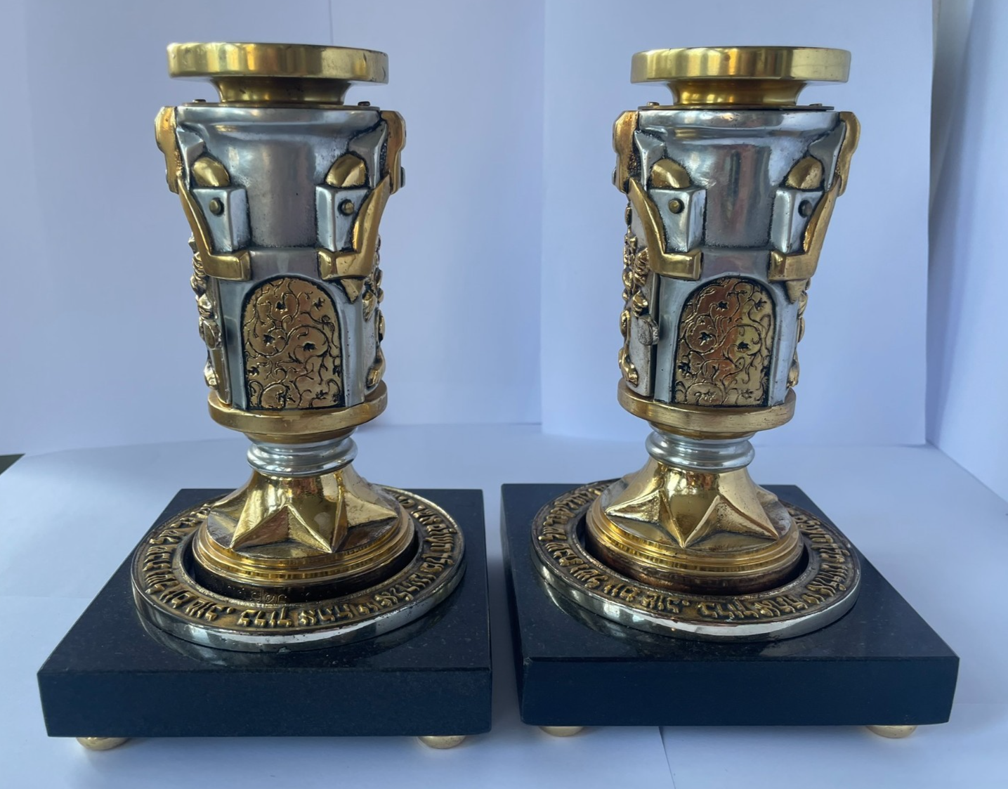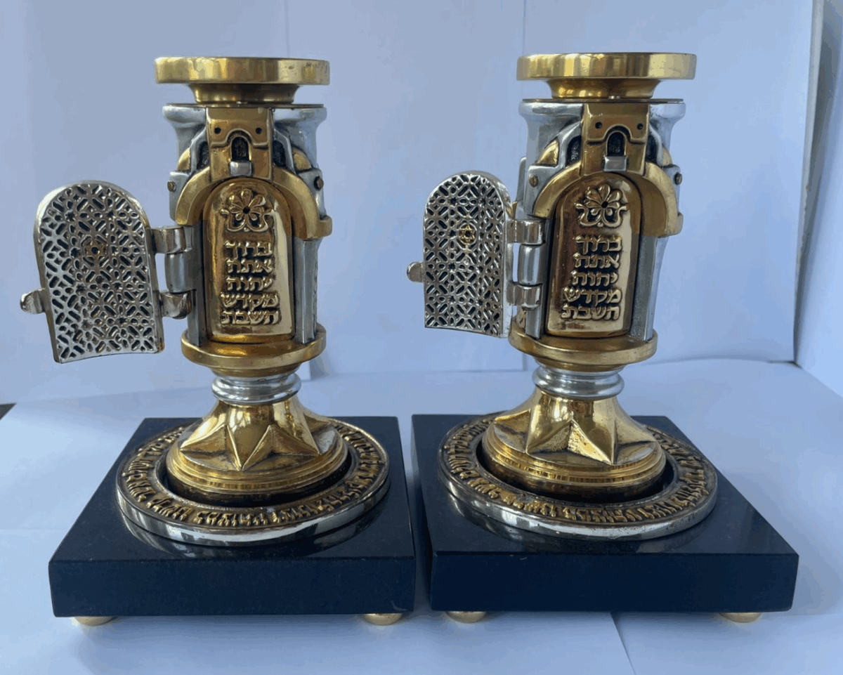 Pair of Elaborate Frank Meisler Shabbat Candlesticks with Granite Plinths
