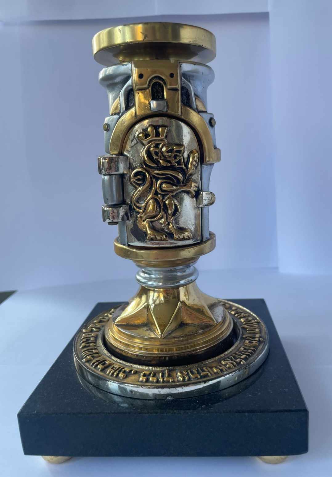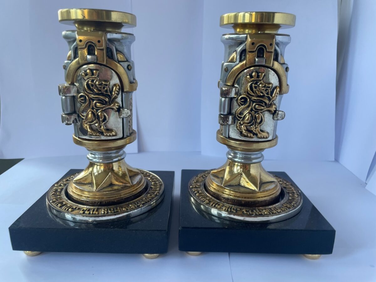 They are crafted in mixed metal alloys and gold and silver plated elements. They each have a door with a lion on that opens and inside is the blessing on lighting the candles in Hebrew.