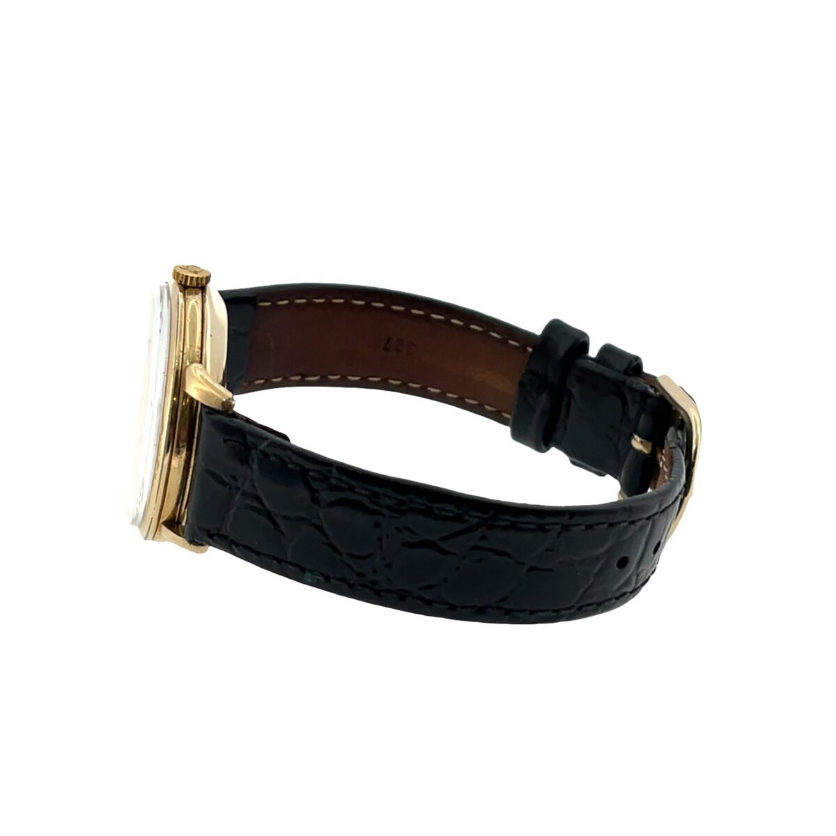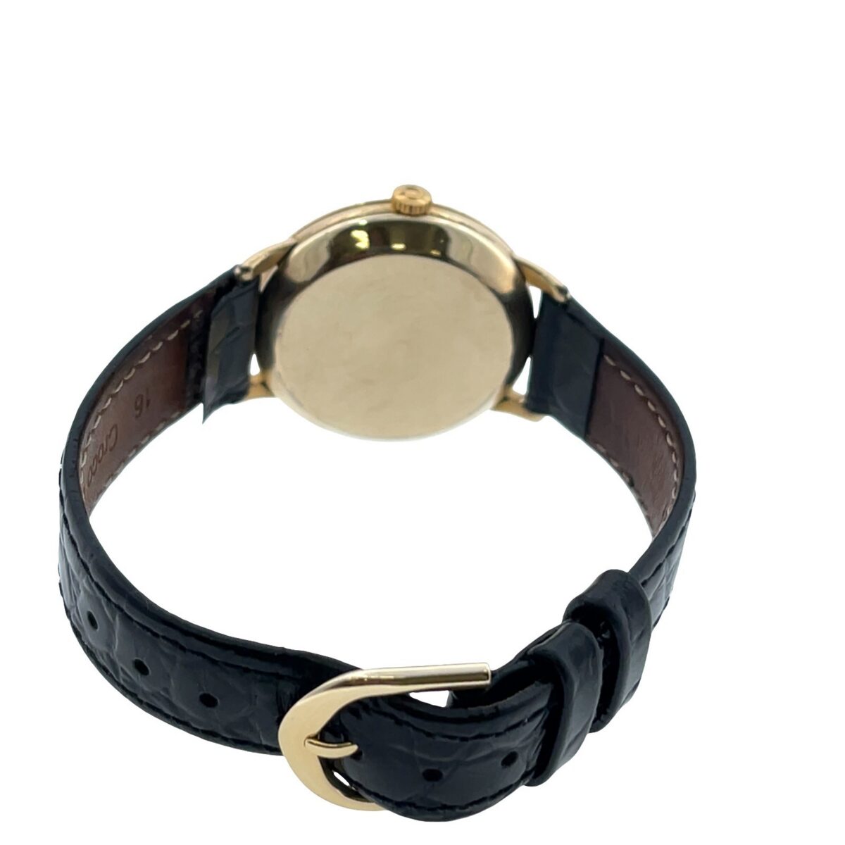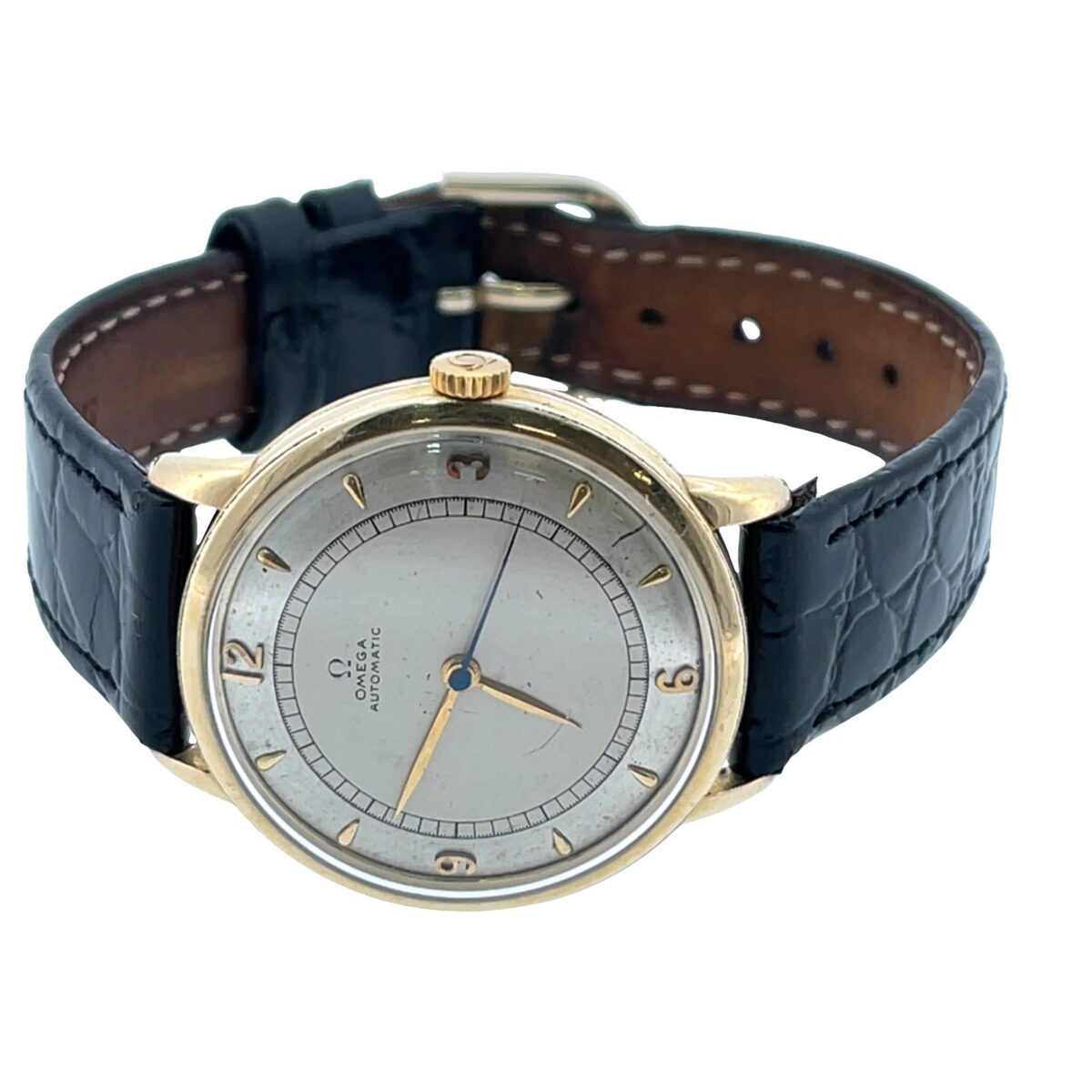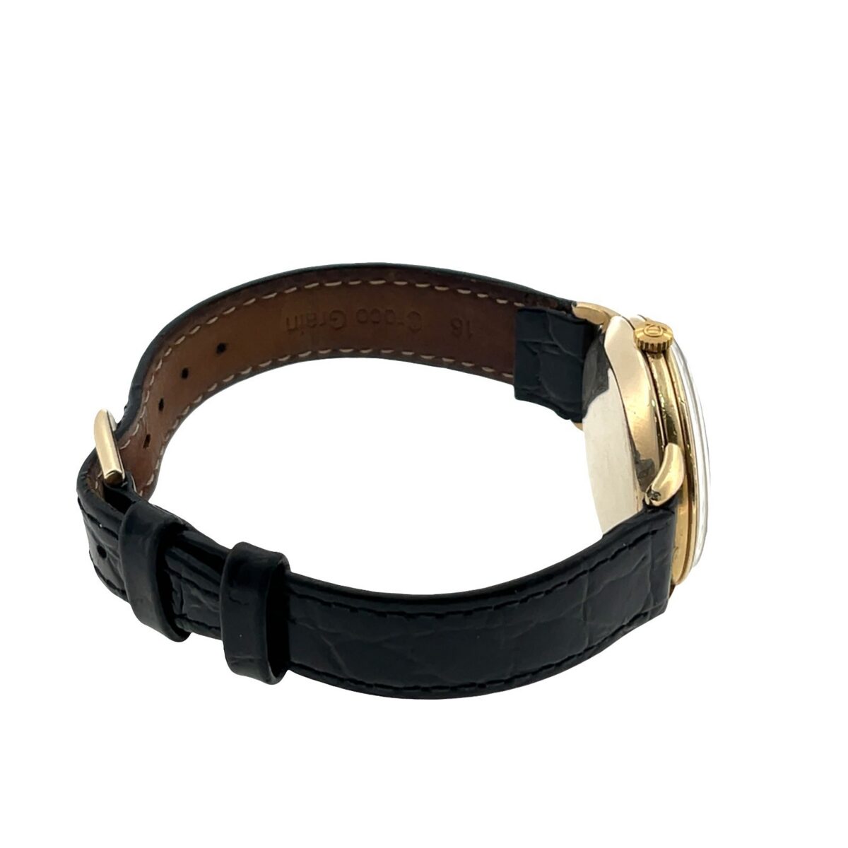 featuring Omega’s early automatic movement with its distinctive bumper winding system. The watch is housed in an elegant gold case, finished with a black leather strap.