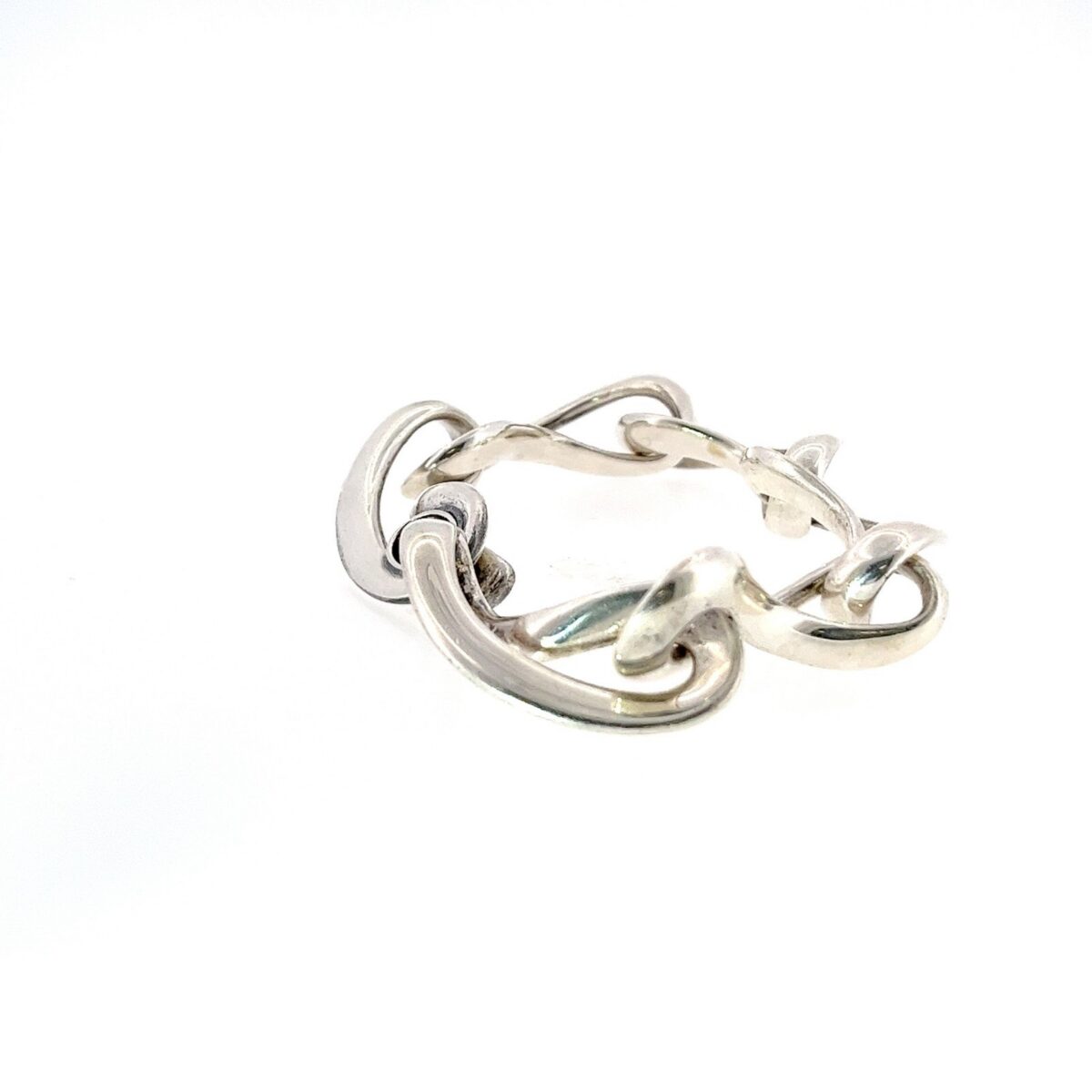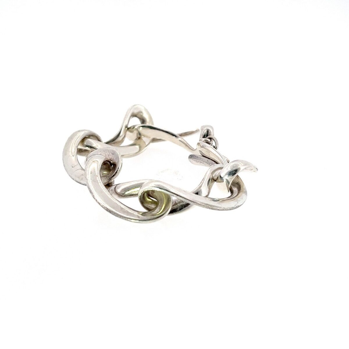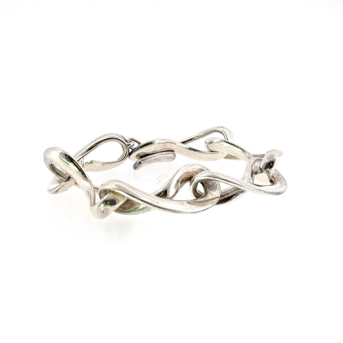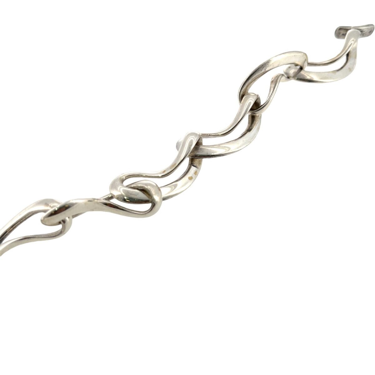 An elegant Georg Jensen bracelet crafted in sterling silver, featuring a series of sculptural infinity-style links finished with a stylish toggle clasp. The flowing, organic design reflects the brand’s signature Scandinavian aesthetic and exceptional craftsmanship.