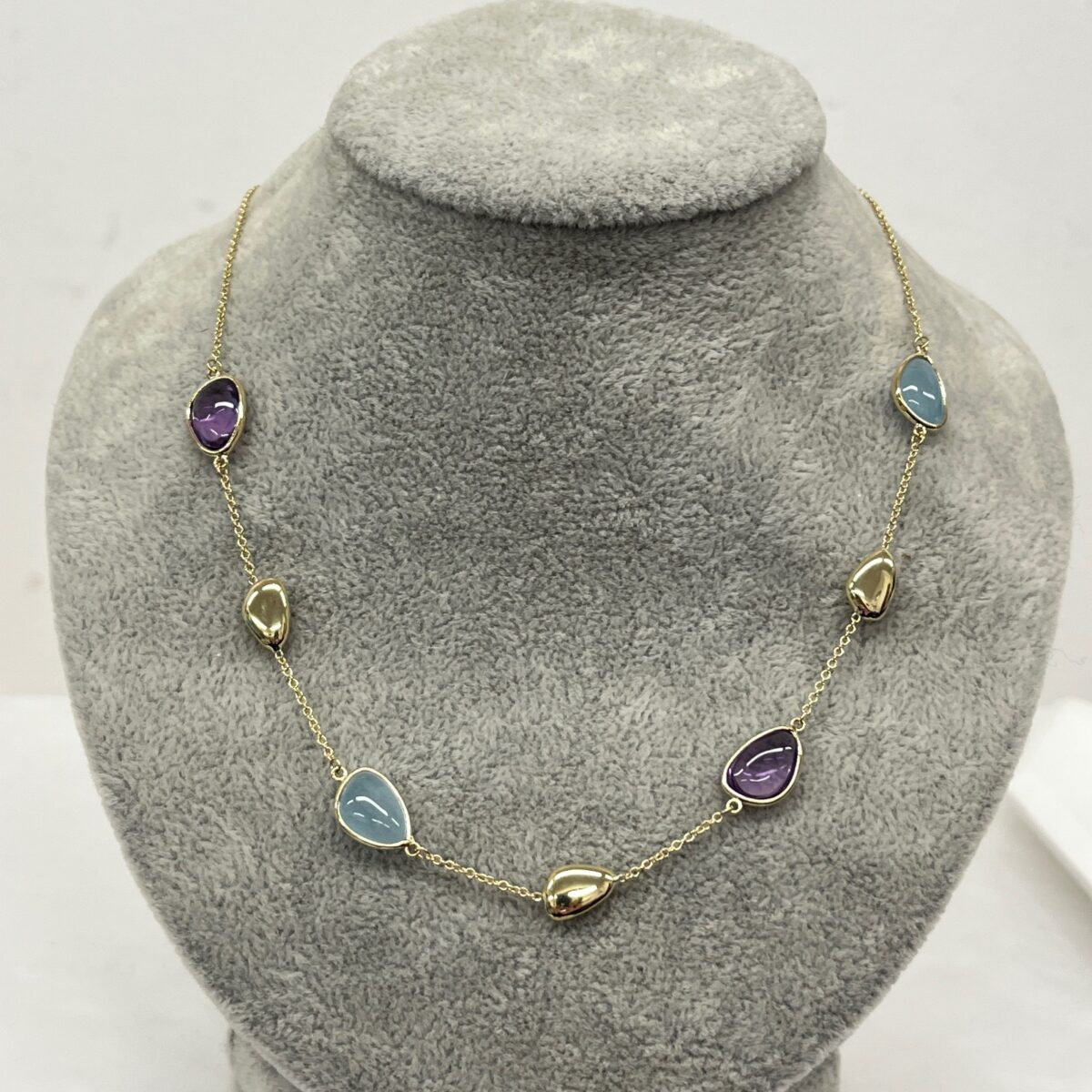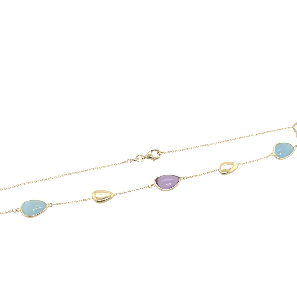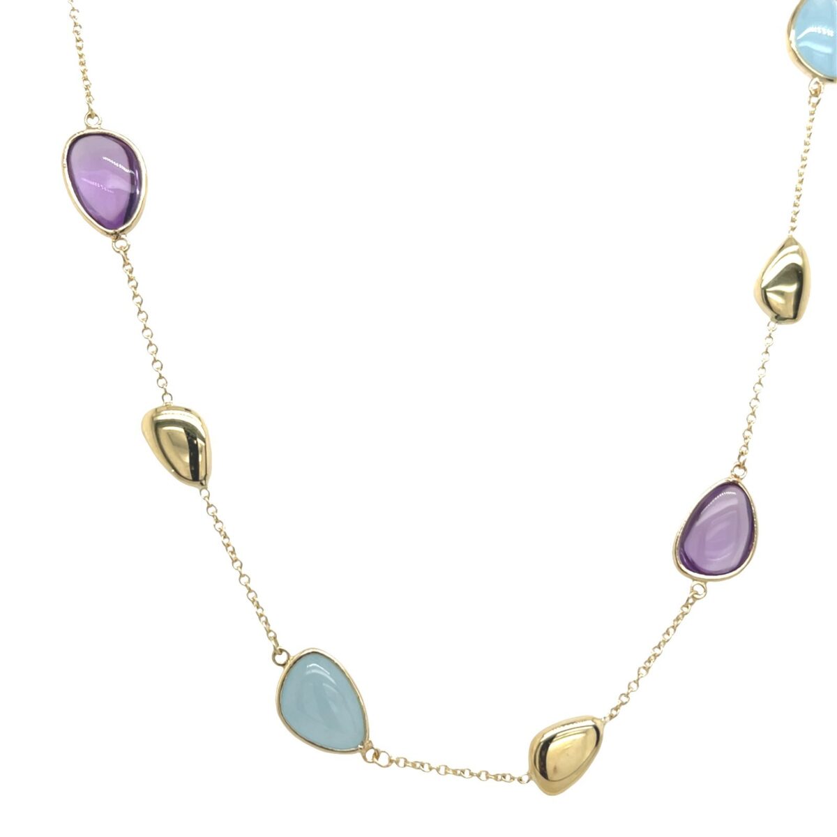 set with a beautiful selection of natural multi-coloured gemstones. Featuring amethyst, milky aquamarine, this necklace offers a harmonious blend of colour and sparkle, perfect for adding personality to any outfit.