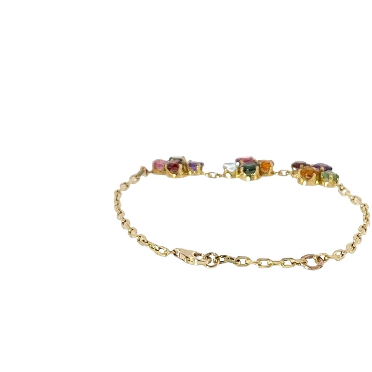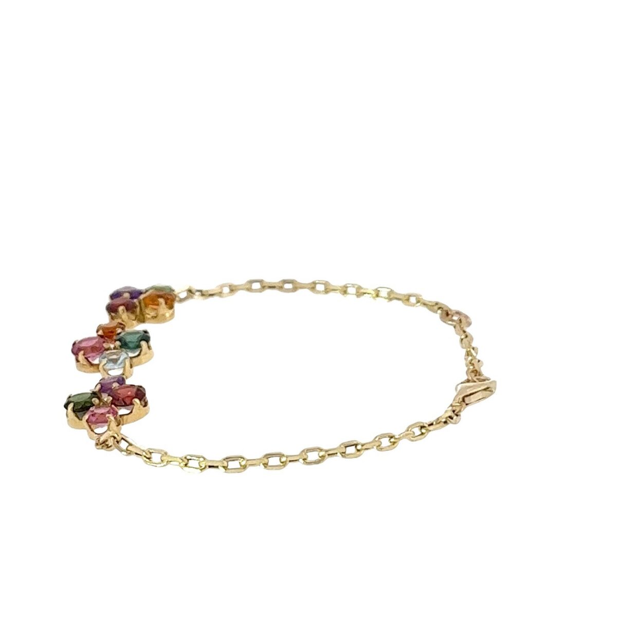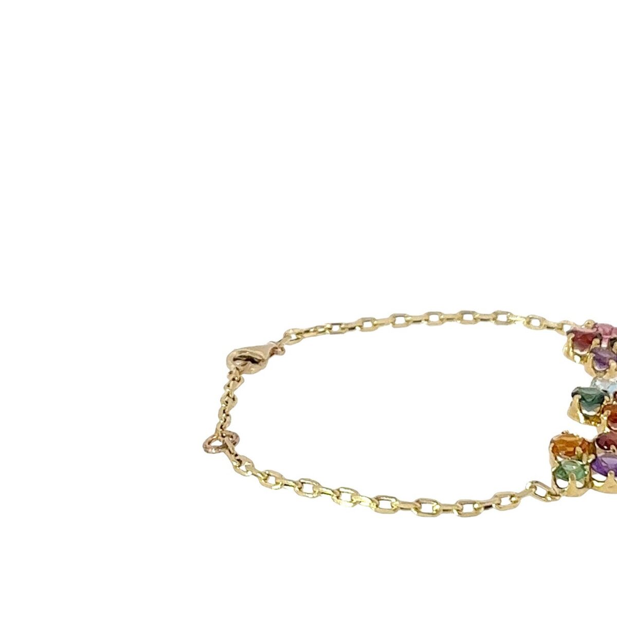 This 18ct & 9ct yellow gold bracelet showcases a captivating array of natural rainbow gemstones in vibrant hues. Each stone is carefully